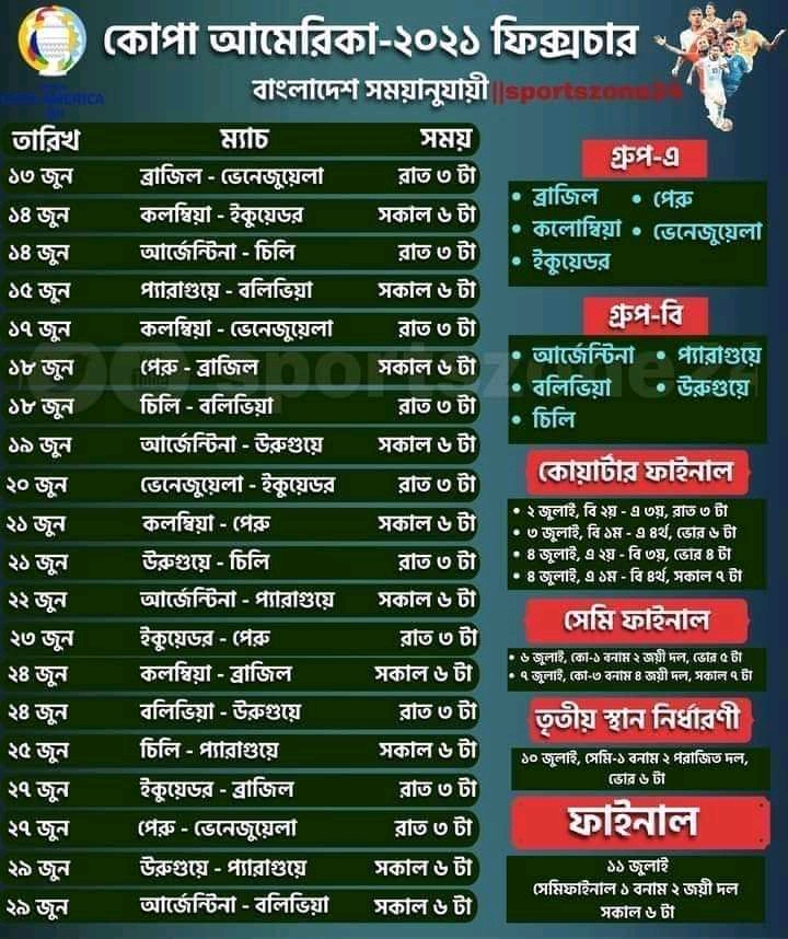 এক নজরে দেখে নিন কোপা আমেরিকার পূর্ণাঙ্গ সূচি। উল্লেখ্য, এখানে সূচির সময় উল্লেখ করা হয়েছে তা বাংলাদেশ সময়ানুযায়ী। রাতেরগুলো দিবাগত রাত ৩টায়। ভোর ৬টার ম্যাচ মানে পরদিন ভোর ৬ টায় শুরু।
