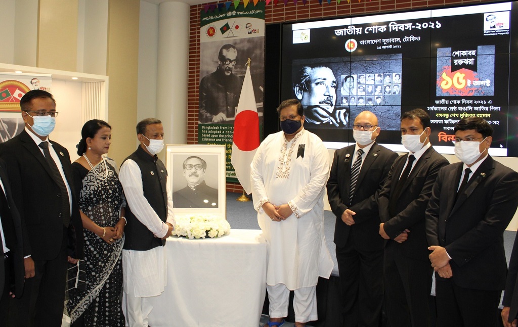 জাপান টোকিও থেকে শিপলু জামান : জাপান টোকিওস্থ বাংলাদেশ দূতাবাস গভীর শ্রদ্ধা আর যথাযথ মর্যাদায় স্বাধীনতার মহান স্থপতি বঙ্গবন্ধু শেখ মুজিবুর রহমানের ৪৬তম শাহাদত বার্ষিকী ও জাতীয় শোক দিবস-২০২১ পালন করেছে। এসময় জাতীয় সঙ্গীত পরিবেশনের সঙ্গে জাতীয় পতাকা অর্ধনমিত করেন জাপানে নিযুক্ত বাংলাদেশের রাষ্ট্রদূত শাহাবুদ্দিন আহমদ।