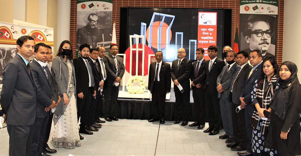 জাপানে নিযুক্ত বাংলাদেশের রাষ্ট্রদূত শাহাবুদ্দিন আহমদের নেতৃত্বে দূতাবাসের সকল কর্মকর্তা- কর্মচারী পুস্পাস্তবক অর্পণ করেন। অনুষ্ঠানের পরবর্তী অংশে দূতাবাস প্রাঙ্গনে আনুষ্ঠানিকভাবে জাতীয় সঙ্গীত বাজানোর সাথে বাংলাদেশের জাতীয় পতাকা অর্ধনমিত করেন রাষ্ট্রদূত। অতঃপর ভাষা শহিদদের স্মরণে এক মিনিট নীরবতা পালন করা হয়।