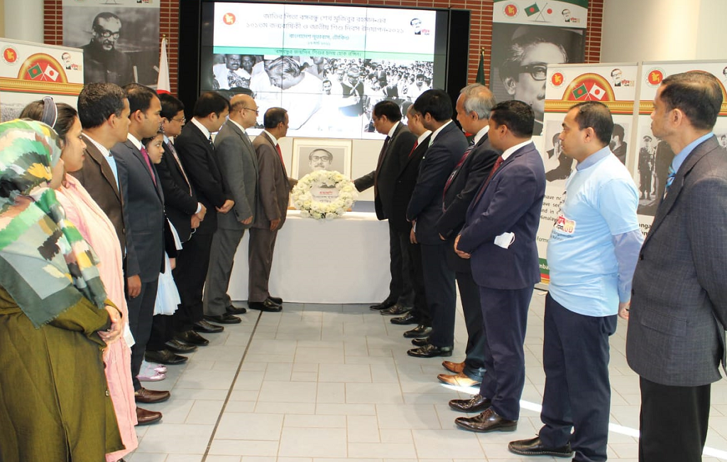 সকালে অনুষ্ঠানের শুরুতে দূতাবাস প্রাঙ্গনে দূতাবাসের কর্মকর্তা – কর্মচারীদের সাথে নিয়ে বঙ্গবন্ধুর প্রতিকৃতিতে ফুল দিয়ে শ্রদ্ধা জানান জাপানে নিযুক্ত বাংলাদেশের রাষ্ট্রদূত শাহাবুদ্দিন আহমদ। পরে জাতীয় সঙ্গীত পরিবেশনের সাথে সাথে রাষ্ট্রদূত কর্তৃক জাতীয় পতাকা উত্তোলন ও জাতির পিতা বঙ্গবন্ধু শেখ মুজিবুর রহমানের স্মৃতির প্রতি শ্রদ্ধা জানিয়ে এক মিনিট নিরবতা পালন করা হয়।
