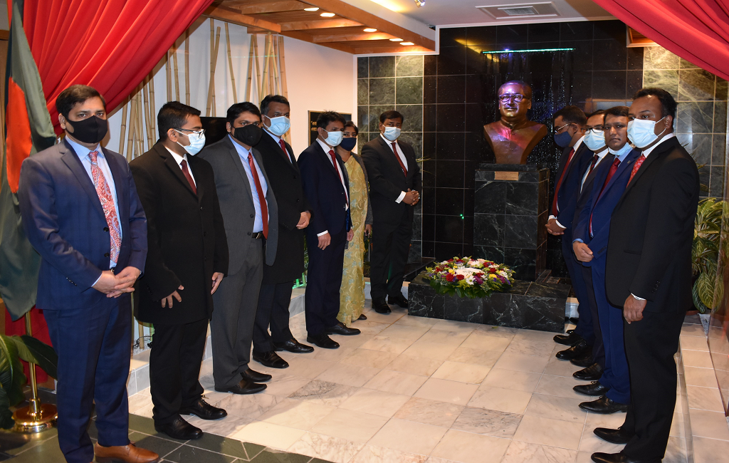 আয়োজনের শুরুতে রাষ্ট্রদূত এম শহিদুল ইসলাম দূতাবাস প্রাঙ্গণে জাতীয় সংগীতের সঙ্গে আনুষ্ঠানিকভাবে বাংলাদেশের জাতীয় পতাকা উত্তোলন করেন। এরপর রাষ্ট্রদূত এবং দূতাবাসের কর্মকর্তাগণ দূতাবাসে অবস্থিত জাতির পিতা বঙ্গবন্ধু শেখ মুজিবুর রহমানের আবক্ষ ভাস্কর্যে শ্রদ্ধার্ঘ্য নিবেদন করেন।