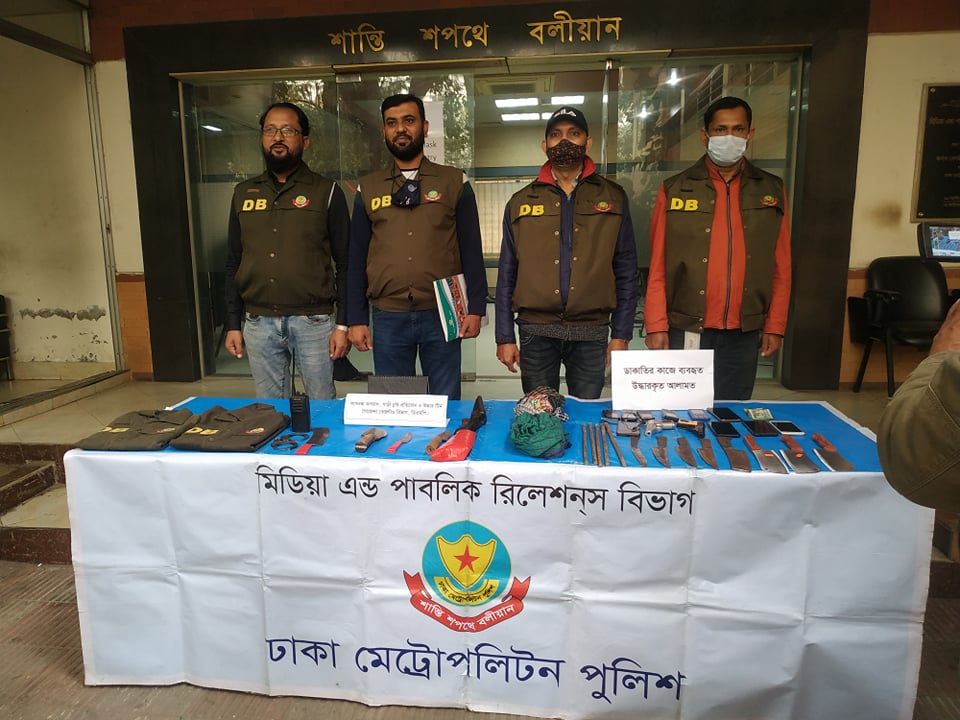 তাদের কাছ থেকে ডাকাতির কাজে ব্যবহৃত ৪টি চাপাতি, ৪টি ছুরি, ৫টি লোহার রড, চোখ বাঁধার কাজে ব্যবহৃত ৩টি গামছা, মোবাইল ১০টি, খেলনা পিস্তল ২টি ও নগদ ৯ হাজার ৮০০ টাকা উদ্ধার করা হয়।