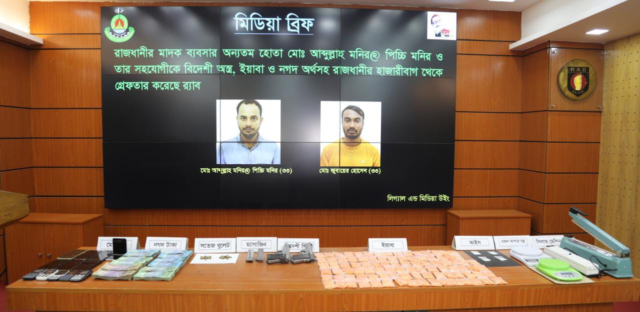 গতকাল বৃহস্পতিবার রাতে রাজধানীর হাজারীবাগ এলাকার মধুবাজারের একটি ফ্ল্যাটে অভিযান পরিচালনা করে মাদক ব্যবসার অন্যতম হোতা আব্দুল্লাহ মনির পিচ্চি মনির (৩৩) ও তার সহযোগী জুবায়ের হোসেন (৩৩) গ্রেপ্তার করেছে র্যাব-২। এ সময় তাদের কাছ থেকে ২টি বিদেশি পিস্তল, ম্যাগাজিন, ১২ রাউন্ড তাজা গুলি, ১৮ হাজার ৭৭০ পিস ইয়াবা, ছয় গ্রাম আইস ও নগদ ৪ লাখ ৬০ হাজার টাকা জব্দ করা হয়েছে।