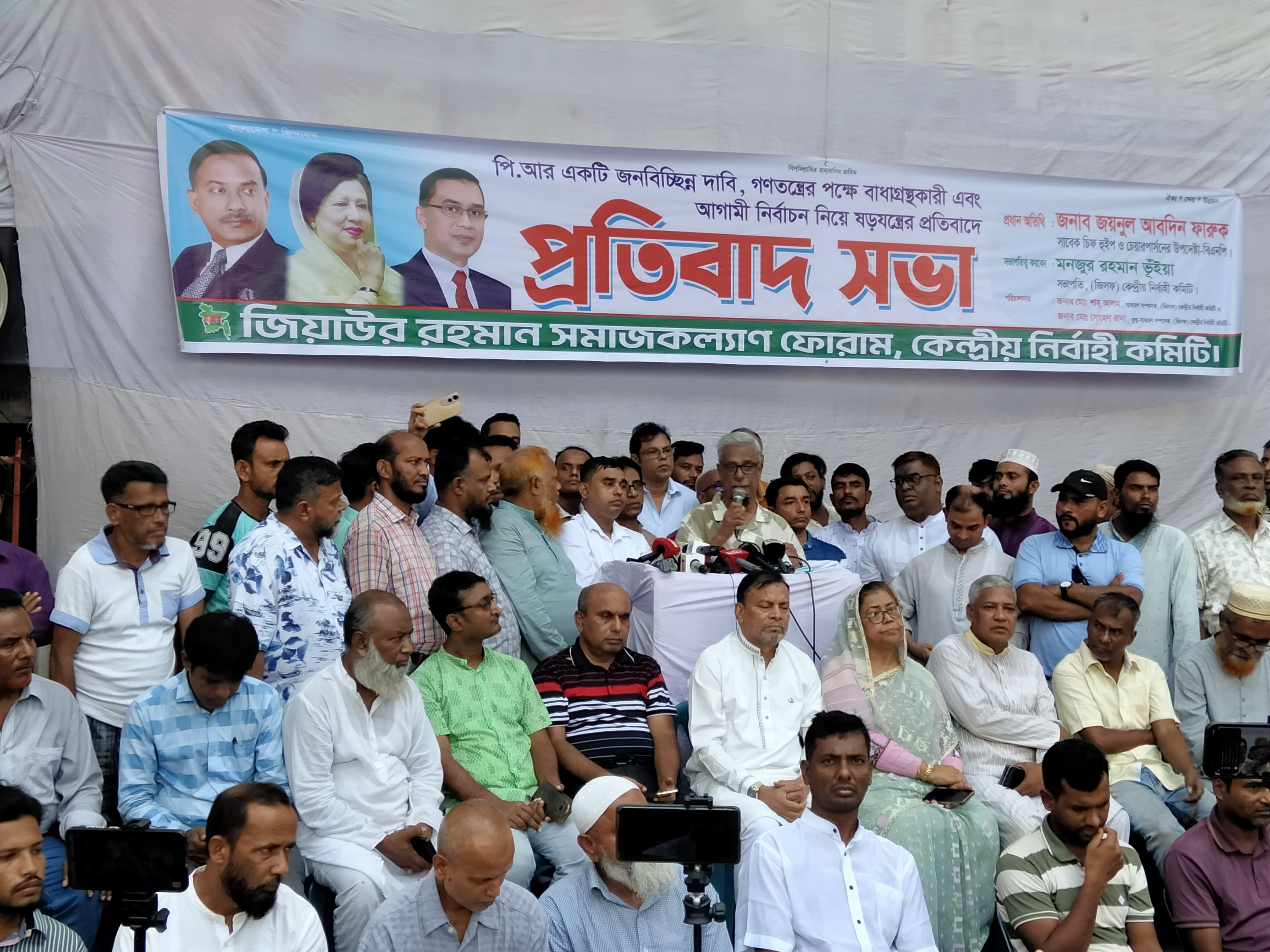 আজ শনিবার জাতীয় প্রেসক্লাবের সামনে জিয়াউর রহমান সমাজ কল্যাণ ফোরামের উদ্যোগে আয়োজিত এক প্রতিবাদ সমাবেশে প্রধান অতিথির বক্তব্যে তিনি এসব কথা বলেন। সমাবেশটি অনুষ্ঠিত হয় “পি আর” নামক একটি “জনবিচ্ছিন্ন দাবি”, গণতন্ত্রবিরোধী কর্মকাণ্ড এবং আসন্ন জাতীয় নির্বাচন নিয়ে চলমান ষড়যন্ত্রের প্রতিবাদে।