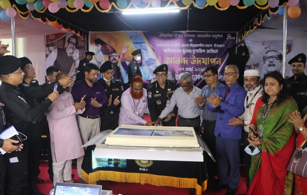 বঙ্গবন্ধু শেখ মুজিবুর রহমান-এর ১৯৭১ সালে ৭ই মার্চ ঢাকার রেসকোর্স ময়দানের ঐতিহাসিক ভাষণ এবং বাংলাদেশ এলডিসি থেকে উন্নয়নশীল দেশে উত্তরণে জাতিসংঘের চ‚ড়ান্ত সুপারিশ প্রাপ্তি উপলক্ষে আনন্দ উদযাপন অনুষ্ঠানে প্রধান অতিথি হিসেবে উপস্থিত ছিলেন র্যাব-৪ এর অধিনায়ক অতিরিক্ত ডিআইজি মোজাম্মেল হক। এ সময় অত্র ব্যাটালিয়নের বিভিন্ন পদবীর র্যাব সদস্যসহ সম্মানিত বীর মুক্তিযোদ্ধা, স্থানীয় গণ্যমান্য ব্যক্তিবর্গ ও বিশিষ্ট রাজনীতিবিদ উপস্থিত ছিলেন।